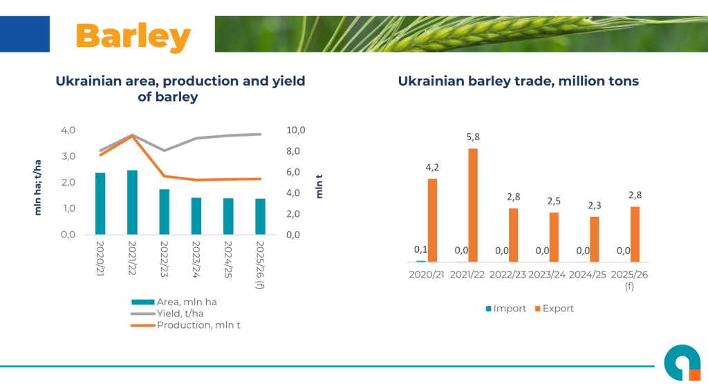 Висновок: попри найбільше зменшення площ серед усіх зернових, ячменю вдалося зберегти обсяги виробництва завдяки зростанню врожайності. Зниження внутрішнього споживання та наявність перехідних запасів дозволяють Україні наростити експорт у 2025/26 МР, задовольняючи попит країн Азії, Африки та Близького Сходу.